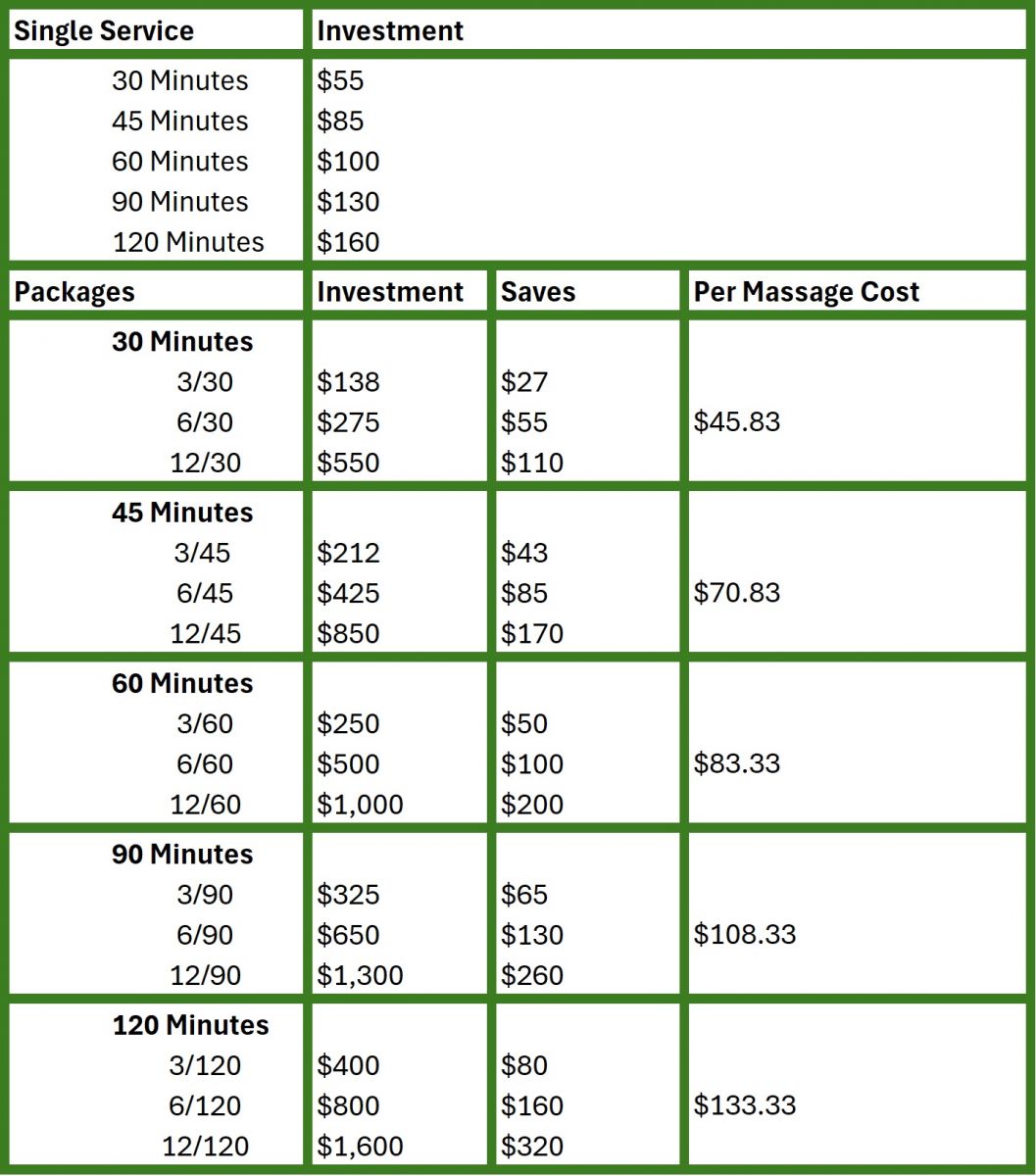 Massage oil or cream is used with smooth, gliding strokes. Swedish massage uses firm but gentle pressure to promote relaxation, ease muscle tension and create other health benefits. It is a classic massage that will ease your stress and allow you to slip into a calm state of relaxation. Hot Hydrotherapy (hot packs) and Aromatherapy included with each massage.